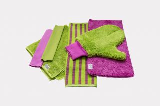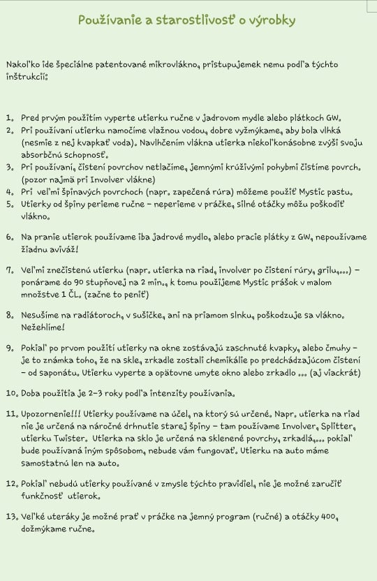 v sade sa nachádzajú okrem 3ks zelených utierok na riad, utierky menčestrové ešte 2 utierky, ktoré sa nedajú kúpiť samostatne a to utierka "chlpatá" - dodáva trvalý lesk na riady zo skla, porcelánu, krištáľu, chrómu bez použitia chemických prostriedkov, odstraňuje aj mastné a iné škvrny z povrchov ako kuchynská linka a pod.,